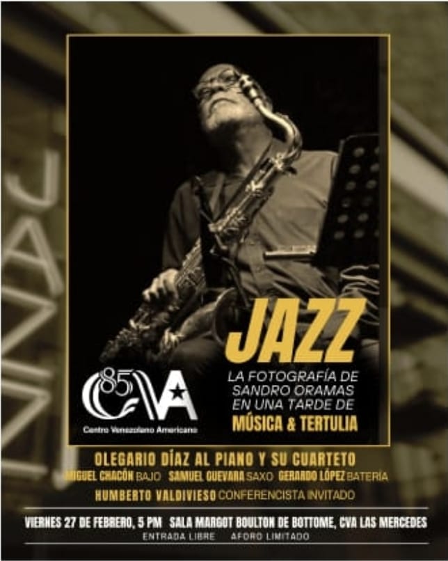En el marco de la exposición “Jazz. Fotografías 1979/2023” del fotógrafo Sandro Oramas, que se presenta actualmente en la Sala Margot Boulton de Bottome del CVA Las Mercedes, se llevará a cabo una tertulia musical en torno al jazz y la fotografía, que tendrá lugar el viernes 27 de febrero de 2026 a las 5:00 p.m., con la participación de Humberto Valdivieso como conferencista invitado y la música en vivo de Olegario Díaz y su cuarteto.