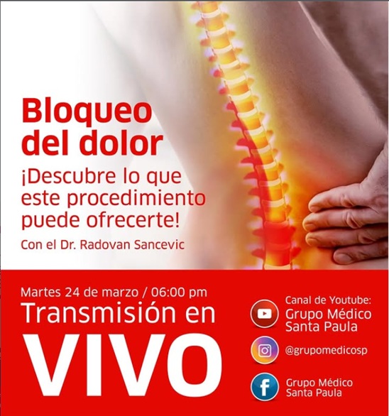 Con el propósito de informar a los usuarios sobre este tratamiento, el GMSP presentará una nueva edición de su programa En Vivo titulada ‘Bloqueo del dolor: descubre lo que este procedimiento puede ofrecerte’, con el doctor Radovan Sancevic. Se transmitirá este martes 24 de marzo a las 6:00 p.m., a través de sus canales de YouTube, Instagram y Facebook como (@grupomedicosp). Durante la actividad, se despejará dudas en tiempo real, permitiendo que las personas conectadas interactúen directamente con el especialista.